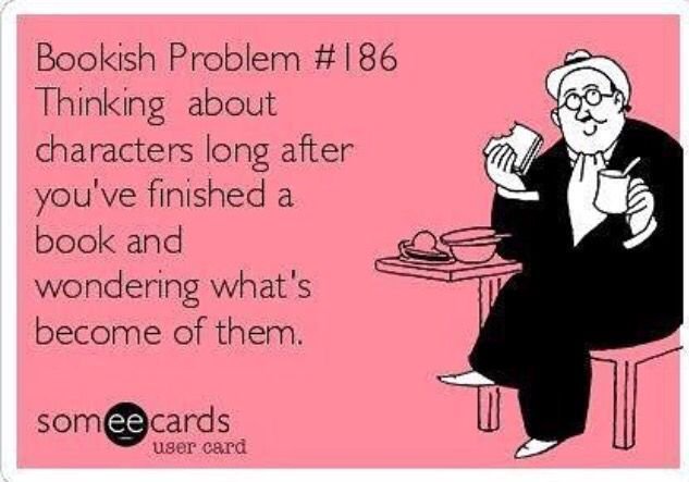 - Nog een vrij serieus probleem: je blijven afvragen hoe het nu is met je favoriete personages, ook als je boek al uit is. Dit is geen onbekend probleem, en ik vermoed dat dit de reden is dat er fanfiction bestaat. En dit is waarschijnlijk ook de reden dat veel mensen liever series lezen dan boeken. Je bent dus niet de enige!