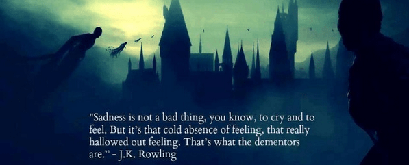 En tot slot, ook uit Harry Potter: de Dementors. Deze wezens zuigen alle geluk uit je weg, en bezorgen je dus in feite een acute depressie. Veroordeeld worden tot een aantal maanden Azkaban is dus niet alleen een vrijheidsstraf, maar ook een psychische straf: je wordt ook veroordeeld tot een aantal maanden depressie. Rowling heeft de Dementors ook bedacht naar aanleiding van de depressie waar ze zelf in terecht kwam na het overlijden van haar moeder.