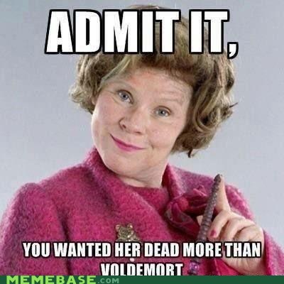 En laat ik dan maar meteen beginnen bij het personage dat meteen door mijn hoofd schoot toen ik dit thema bedacht: Dolores Umbridge/Dolores Omber uit Harry Potter. Degene die roze een slechte naam weet te bezorgen. En degene die, in mijn optiek, slechter is dan Voldemort zelf. Waarom? Omdat Voldemort, doordat hij is verwekt onder invloed van een liefdesdrank en is opgegroeid in een weeshuis (waar hij ook geen liefde kreeg) een soort psychologisch defect heeft in zijn hoofd. Maar Omber kíest ervoor om gemeen te zijn en zich als een pestkop te gedragen om zo haar eigen superioriteit te bevestigen. En dan ben je, in mijn ogen, een vrij grote slechterik.