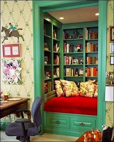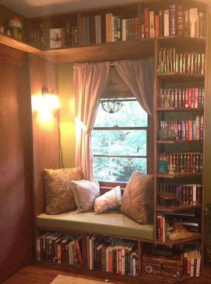 Kijk nou hoe schattig, een bankje in de vensterbank, waar de boekenkast omheen gebouwd is, en dan kun je ook nog naar buiten kijken terwijl je af en toe wegdroomt met je boek… Dat is toch iets wat je als boekenliefhebber wil?