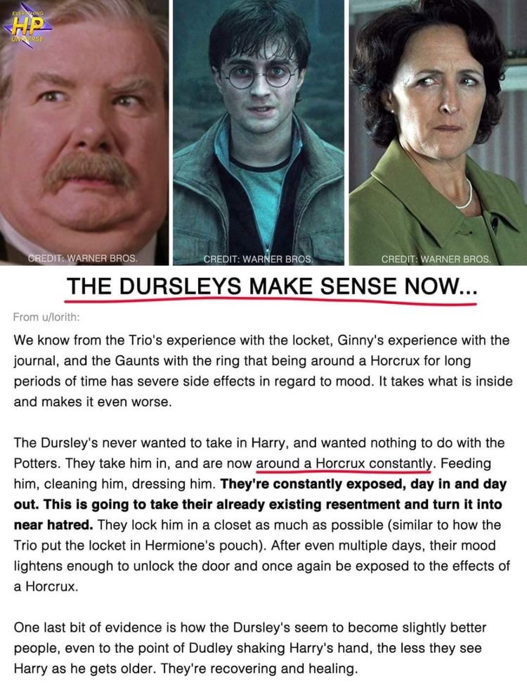 Oke, met deze theorie ben ik het niet eens. Waarom niet? Omdat Harry enorm veel met Ron en Hermelien optrekt, en als de Duffelingen zo beïnvloed werden door het feit dat Harry een Gruzielement is, dan zou je verwachten dat Ron en Hermelien dus ook somber worden en Harry gaan haten, net zoals de Duffelingen. En je zou ook verwachten dat alle andere mensen om Harry heen dat doen, inclusief Sirius, Lupos, de hele familie Wemel, de docenten op Zweinstein, Hagrid en Dobby. Maar dat is niet het geval, ze geven allemaal om Harry. Dat klopt niet met deze theorie.