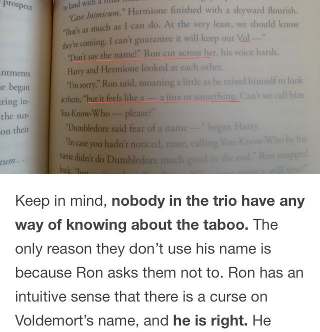 Een deel van de tekst is hier weggevallen, maar de basis staat er wel. In deel zeven (Relieken van de Dood) heeft Ron door dat de naam van Voldemort ‘taboe’ is. De naam is voorzien van een Merk, net zoals minderjarige heksen en tovenaars. Hierdoor kunnen de Dooddoeners iedereen vinden die de naam Voldemort gebruikt. En aangezien Harry de naam van Voldemort regelmatig gebruikt (net als andere leden van de Orde van de Feniks), kunnen de Dooddoeners steeds met gemak op het spoor komen van Harry, Ron en Hermelien.