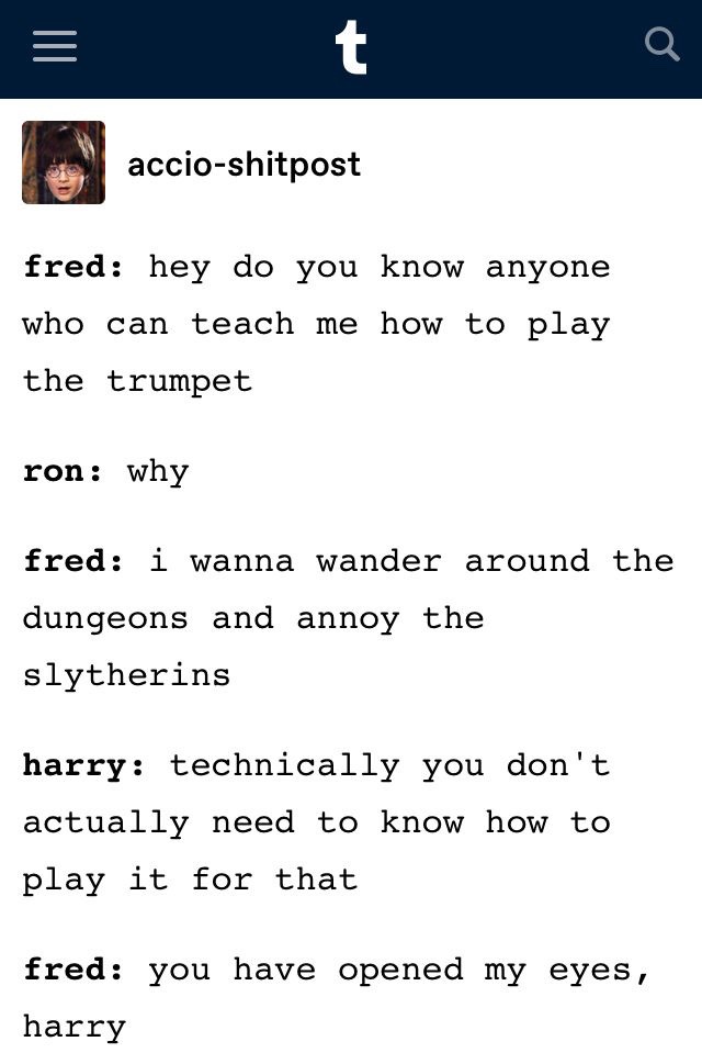 Oke, en deze is gewoon om even luchtig af te sluiten. Want wie heeft er trompetles nodig om de Zwadderaars te irriteren als je ook gewoon op die trompet kan gaan blazen zonder les? Hoe minder les, des te groter is de irritatiefactor voor de omgeving… Maar goed dat Harry dat Fred even liet inzien 😉