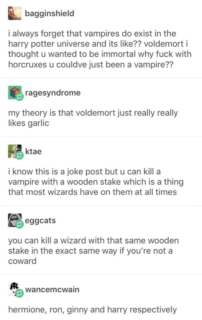 He, Voldemort, heb je er al over nagedacht om een vampier te worden? Ik bedoel… Je hebt de bleke huidskleur al. Je moet alleen accepteren dat je nooit meer knoflook kan eten. O, dat is te veel moeite? Joh, prima. Ga je lekker door met moorden en Gruzielementen maken. Je weet dat je daarmee niet echt onster… Oké oké, ik zeg al niets meer…